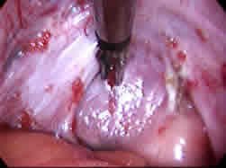 أما بالنسبة لشكل الإندومتريوزيس من خلال المنطار فيبدوا وكأنه رأس عود الثقاب في بعض الأحيان، وفي أحيان أخرى قد يبدو بتغيرات في الغشاء البريتوني المبطن للحوض. أما في المراحل المتقدمة من المرض (المرحلتين الثالثة والرابعة) فنلاحظ وجود الإلتصاقات بين أجزاء الخوض وأعضاءه المختلفة، والذي يؤدي بدوره إلى التأثير المباشر على قناتي فالوب، ويؤدي بالطبع إلى تأخر الحمل.