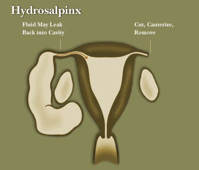Sometimes the far end part would be closed by several lesions like infection, endometriosis or previous pelvic surgery. This will form a condition known as hydrosalpinx as fluid may accumulate inside the tube. Fluid may leak back to the uterine cavity and negative lively affect the implantation of the embryo. Hydrosalpinx may or may not be diagnosed by ultrasound but the definitive way to diagnose is by doing HSG or laparoscopy. It is advisable in these cases to separate the uterus from the Fallopian tubes on the side affected.