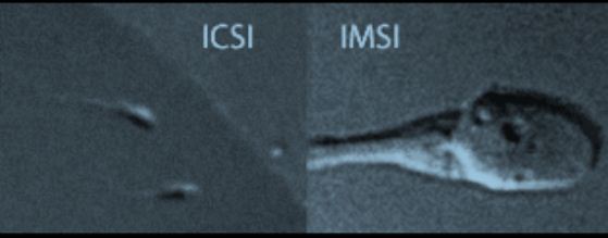 رابع : إختيار الحيوانات المنوية بالتكبير المتناهي Intracytoplasmic Morphologically Selected Sperm Injection (IMSI ) يتم تكبير الحيوان المنوى من خلال الحقم المجهرى العادى حتى 200-400 مرة ولكن بإستخدام هذه التقنية يتم التكبير بأكثر من 6000 مرة بحيث قد تظهر عيرب معينة برأس الحيوان المنوى وقد وجدت الأبحاث أن العيوب التى تظهر تحت هذا التكبير ترتبط بوجود أجنة غير سليمة ولما إستخدمت هذه التقنية إرتفعت نسب الحمل والولادة ويظهر فى الصورة الأتية الفرق بين شكل الحيوان المنوى بالتكبير العادى مقاؤنة بالتكبير المتناهى